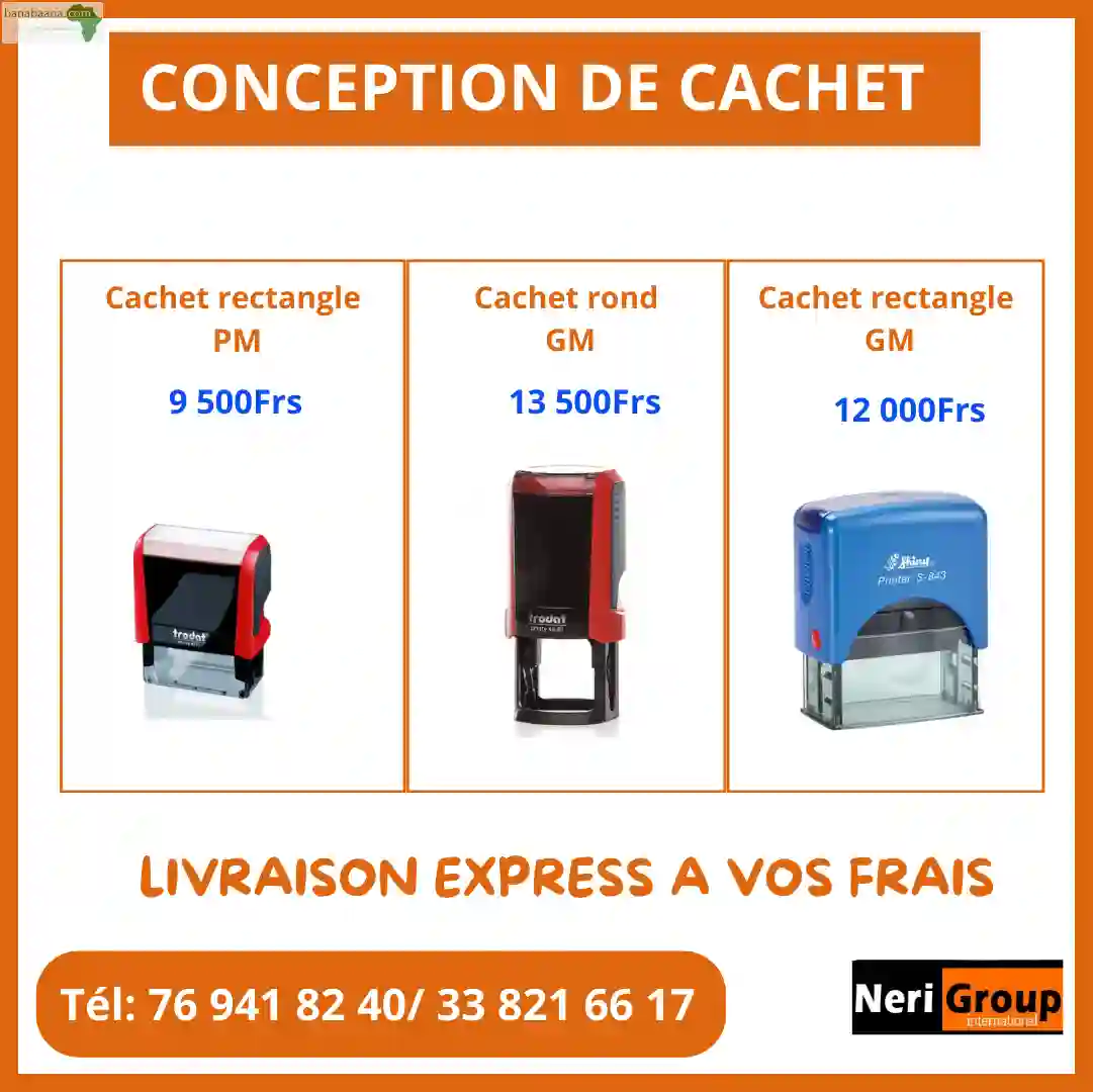 Nous proposons des cachets adaptés à vos besoins, qu'ils soient professionnels ou personnels. Nos cachets sont de haute qualité et répondent à toutes vos exigences. Cachet Rectangle PM à 9.500 f Cachets Rectangle à 12.000 f Cachets Ronds GM à 13.500 f LIVRAISON PARTOUT A DAKAR A VOS FRAIS.