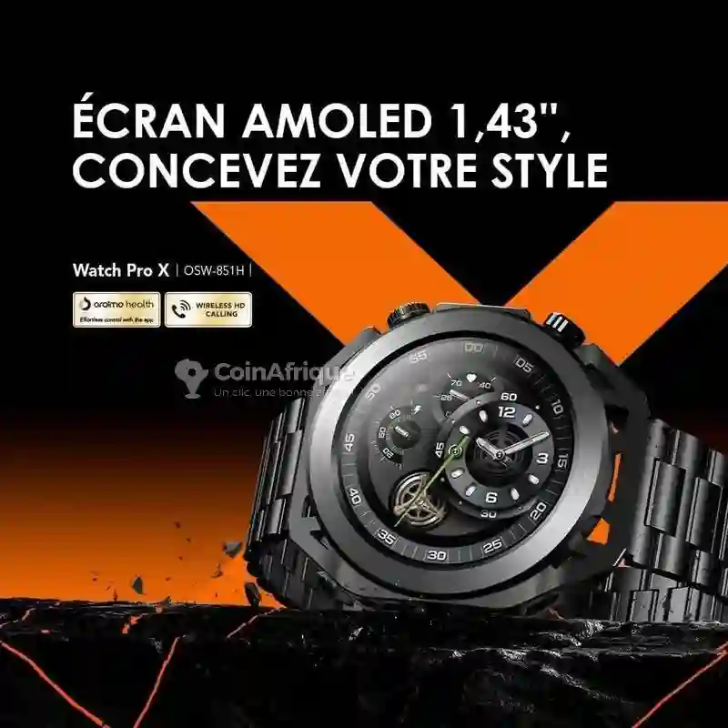Oraimo watch prox (osw-851h) écran : amoled 1,43 pouces, haute luminosité, couleurs vives verre renforcé, affichage always-on (selon réglages) design & matériaux : boîtier métallique robuste bracelet en acier (interchangeable) boutons physiques + couronne rotative connectivité : bluetooth appels bluetooth hd (micro + haut-parleur intégrés) capteurs & santé (oraimo health) : capteur de fréquence cardiaque 24h/24 mesure spo₂ (oxygène dans le sang) suivi du sommeil podomètre, calories, stress rappels santé (sédentarité, hydratation) sports & activités : plusieurs modes sportifs intégrés suivi des performances en temps réel.