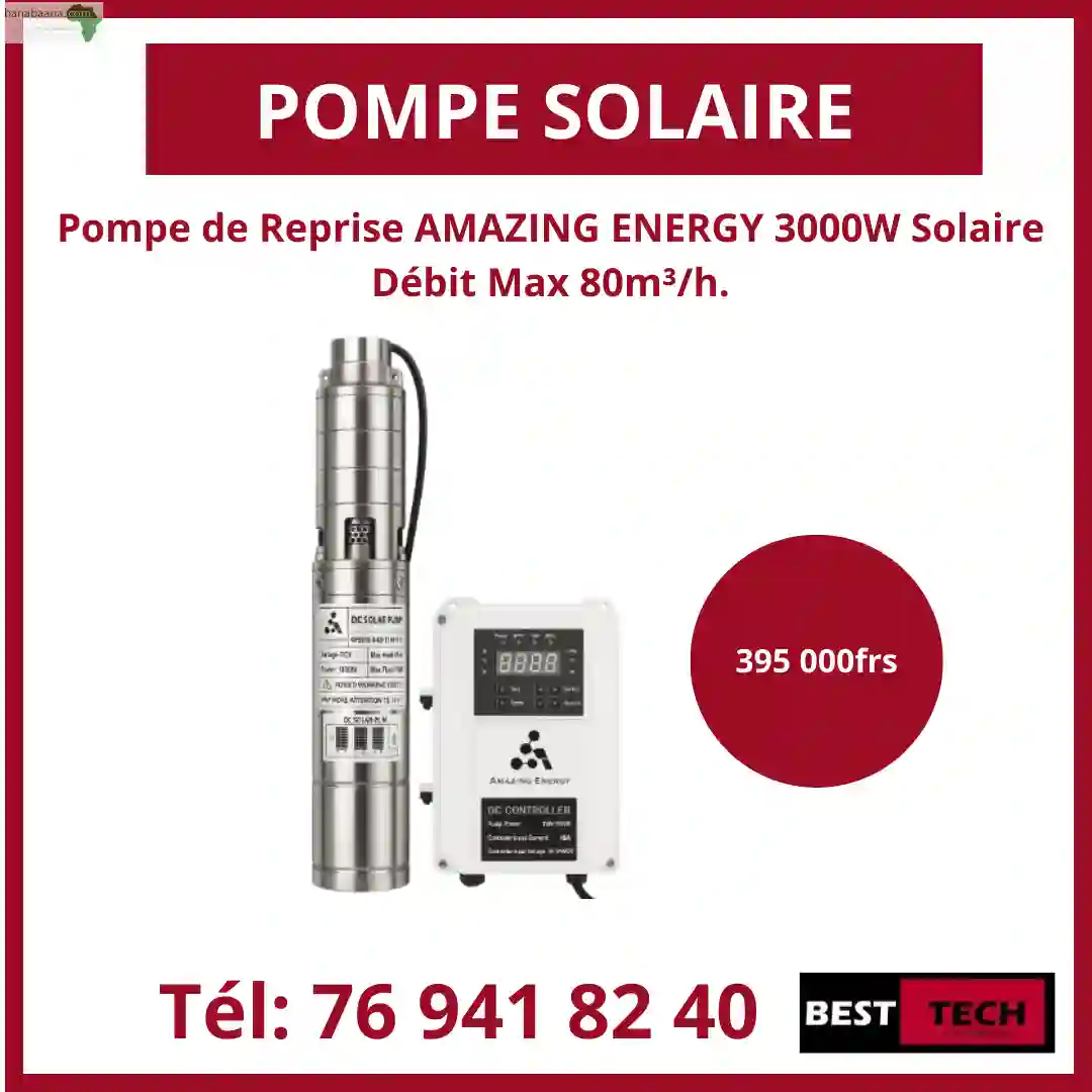 Bonjour, chers clients, Best continental vous propose des POMPE SOLAIRES de très bonne qualité. Profitez de notre promotion du moment. POMPE SOLAIRE 3m3/H –60M PROF MAX 400W : 125.000 FCFA POMPE SOLAIRE 6m3/H –40M PROF MAX 600W : 180.000 FCFA pOMPE SOLAIRE 14.5 m3/H–45M PROF MAX 750W : 270.000 FCFA POMPE SOLAIRE 14.5m3/H –100M PROF MAX 2200W: 290.000 FCFA POMPE SOLAIRE 17m3/H –48M PROF MAX 1500W : 360.000 FCFA POMPE SOLAIRE 20m3/H –65M PROF MAX 2200W : 290.000 FCFA POMPE SOLAIRE 36m3/H –175 PROF MAX 9200W : 1.200.000 FCFA POMPE SOLAIRE 65m3/H –200M PROF MAX 18500W : 2.100.000 FCFA POMPE DE REPRISE SOLAIRE 80m3/H –3000W : 395.000 FCFA PRODUIT GARANTI LIVRAISON PARTOUT A DAKAR