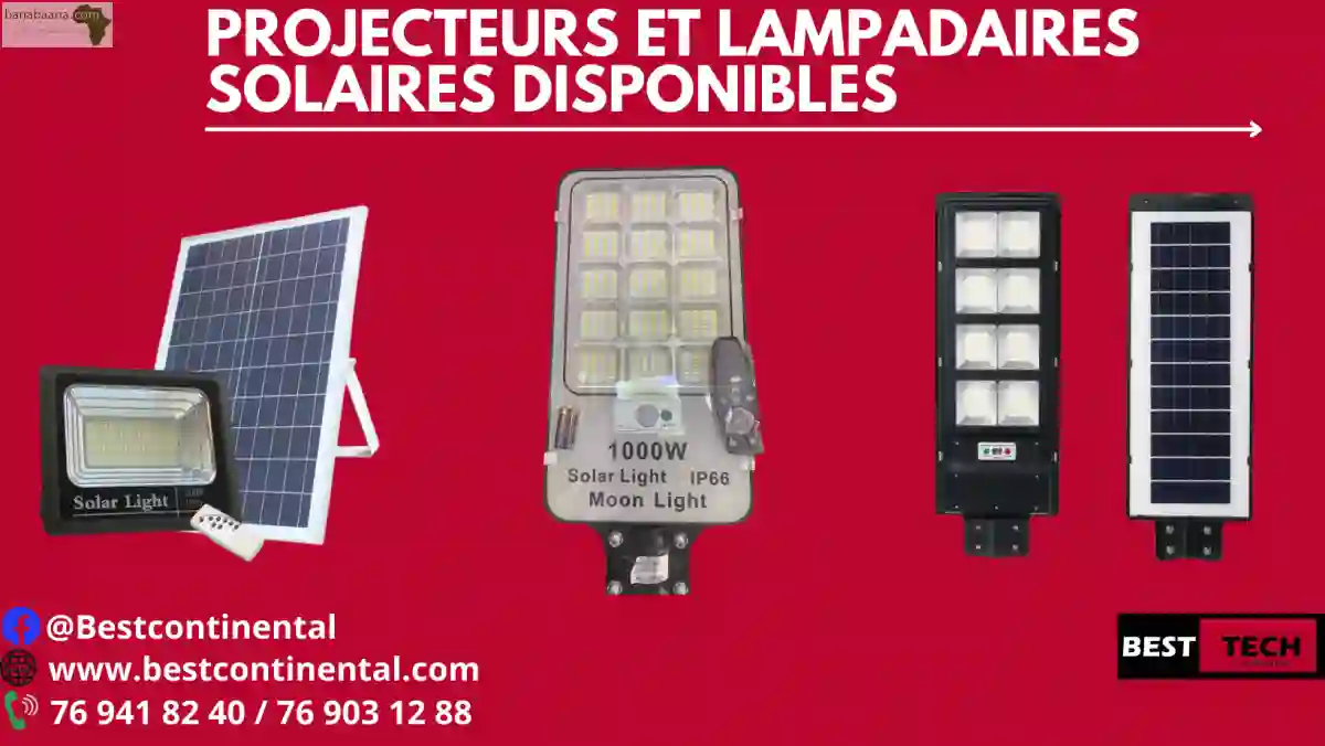 Chers clients, BEST CONTINENTAL vous propose des LAMPADAIRES ET PROJECTEURS SOLAIRE de très bonne qualité, muni d'une télécommande. Très solide avec une longue durée d'éclairage jusqu'à 12 H d'éclairage LED sans coupure et plus. PRIX LAMPADAIRE : Lampadaire solaire 100 WATT : 55.000 CFA Lampadaire solaire 200 WATT : 65.000 CFA Lampadaire solaire 300 WATT : 70.000 CFA Lampadaire solaire 600 WATT : 75.000 CFA Lampadaire solaire 800 WATT : 85.000 CFA Lampadaire solaire 1000 WATT : 95.000 CFA PRIX PROJECTEUR : Projecteur solaire 100 WATT : 35.000 CFA Projecteur solaire 200 WATT : 45.000 CFA Projecteur solaire 300 WATT : 55.000 CFA Projecteur solaire 400 WATT : 60.000 CFA Projecteur solaire 500 WATT : 65.000 CFA Projecteur solaire 600 WATT : 75.000 CFA Projecteur solaire 800 WATT : 95.000 CFA Projecteur solaire 1000 WATT : 110.000 CFA LIVRAISON PARTOUT A DAKAR